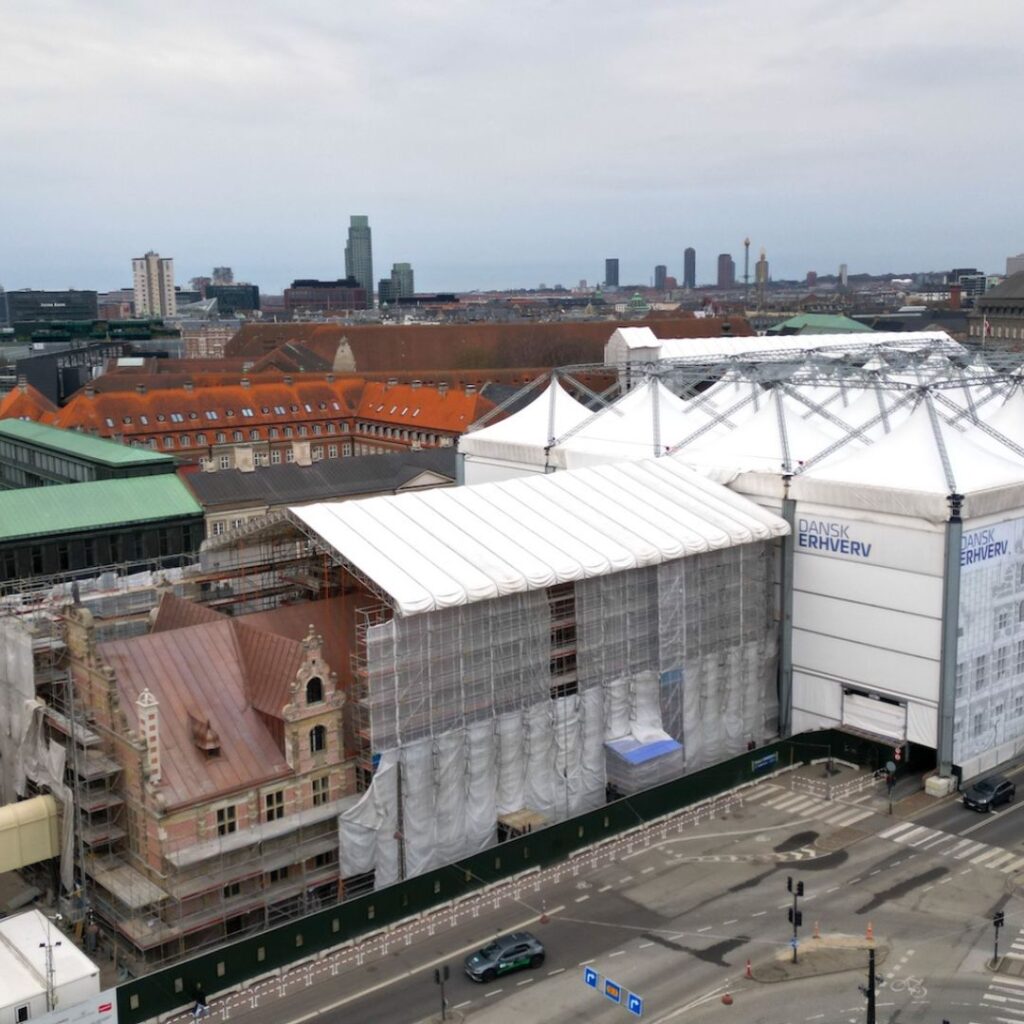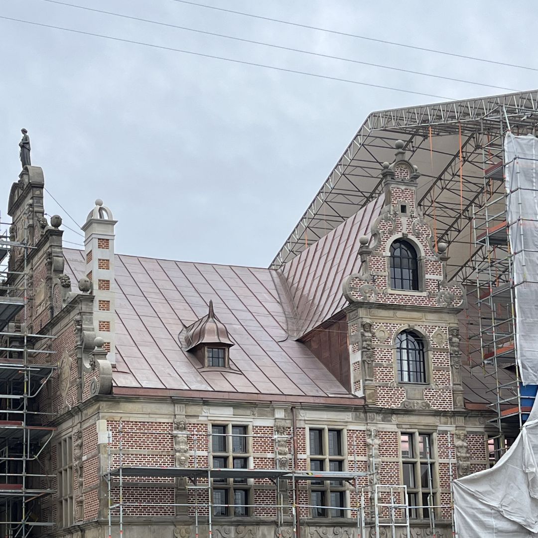 I disse dage pakker stilladsfolkene stille og roligt den store indpakning væk. Det betyder ud over at vi er i mål med taget, også at man fra Børsgade nu kan se det endelige resultat i murværk, sandsten og kommertag.