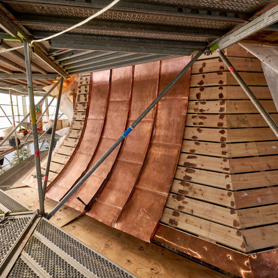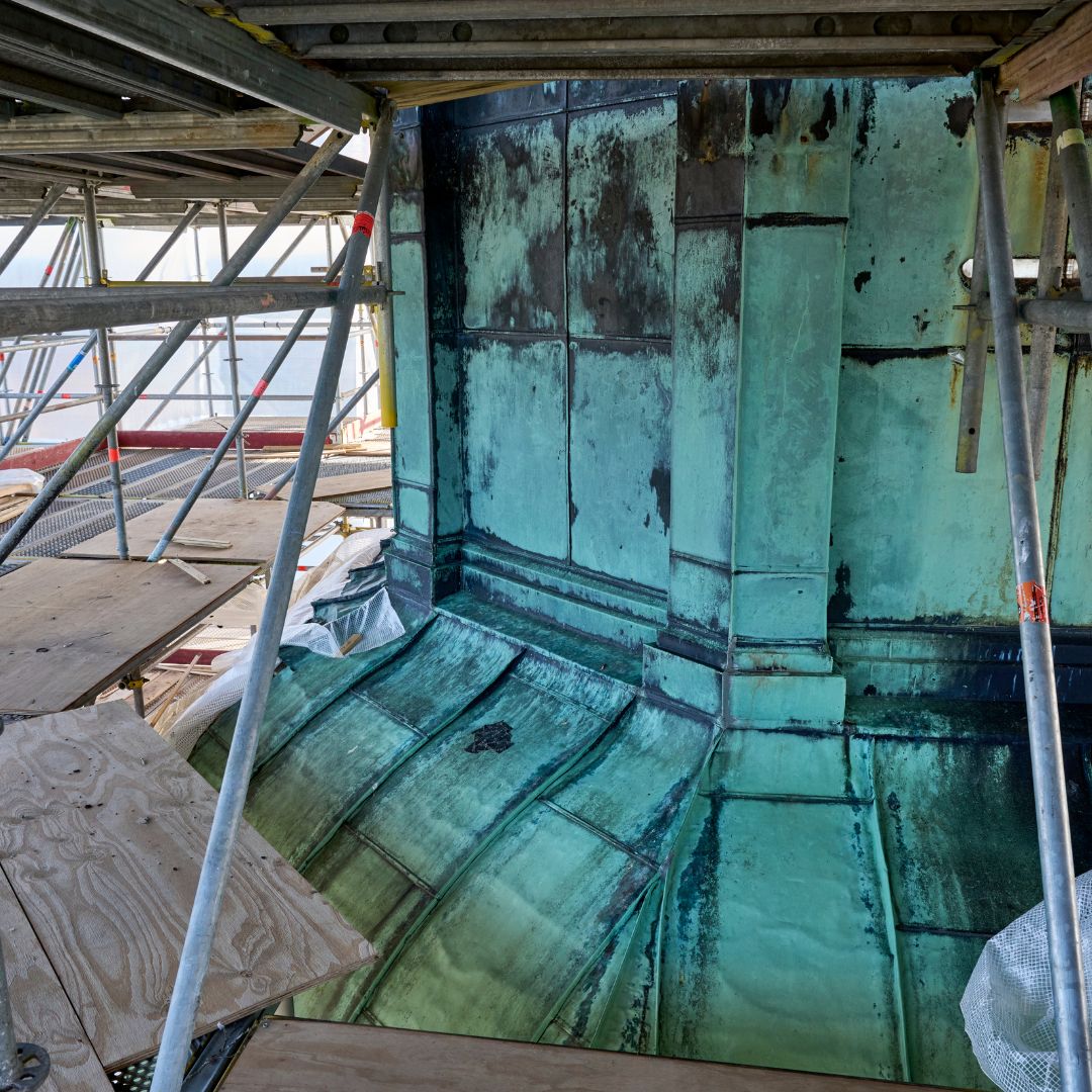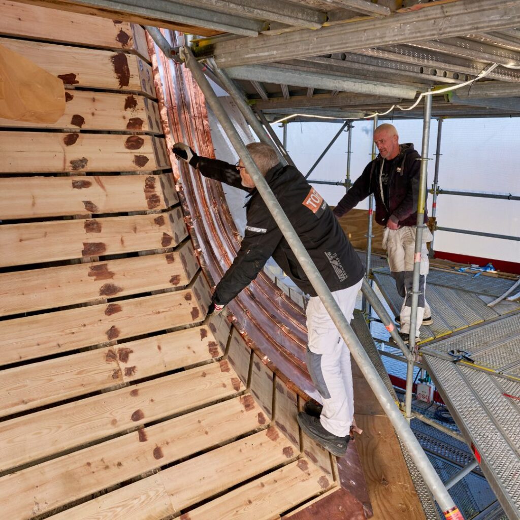 Vi skal skifte alt kobberet på tårnet. Når det demonteres, samles det sammen og sendes til omsmeltning til nyt kobber.