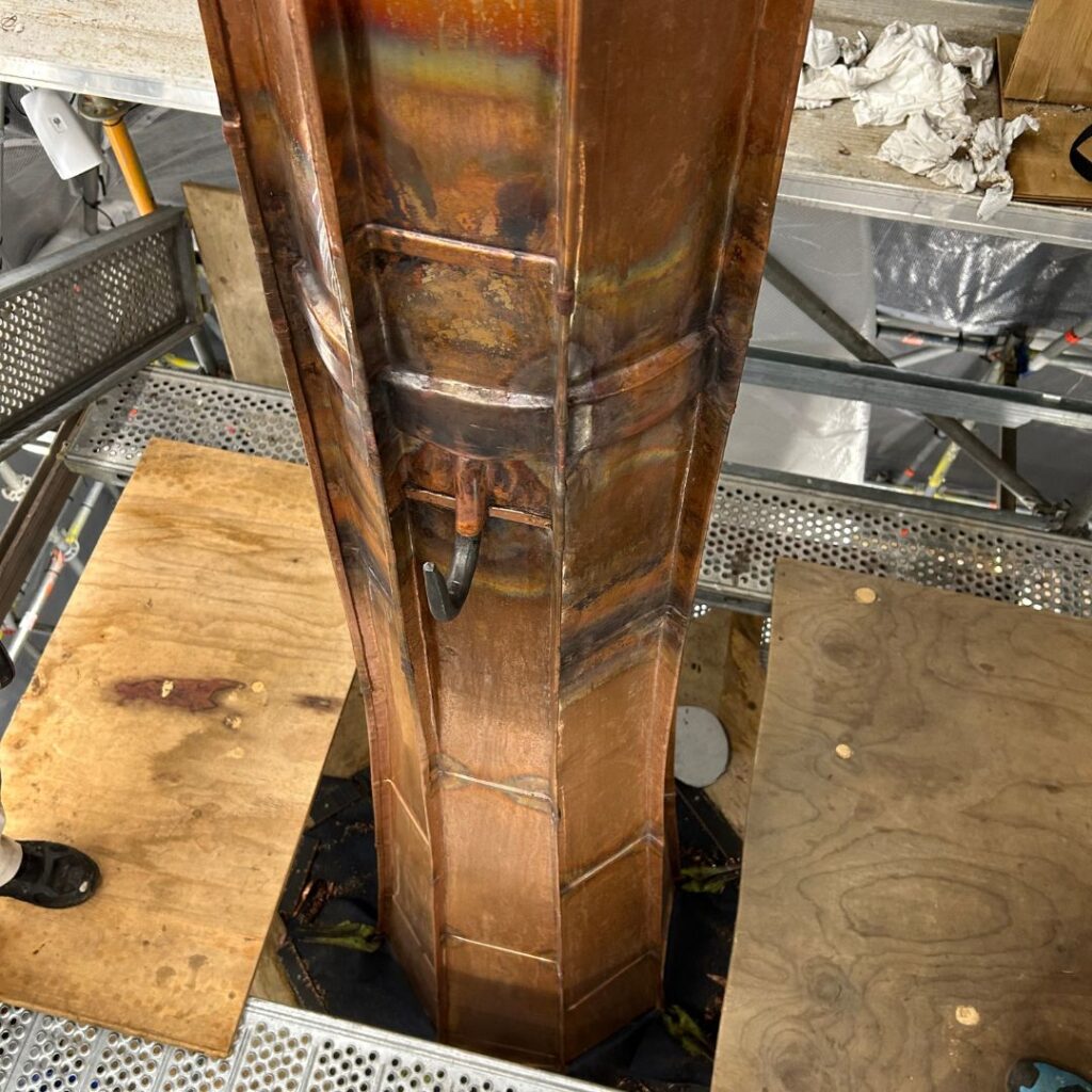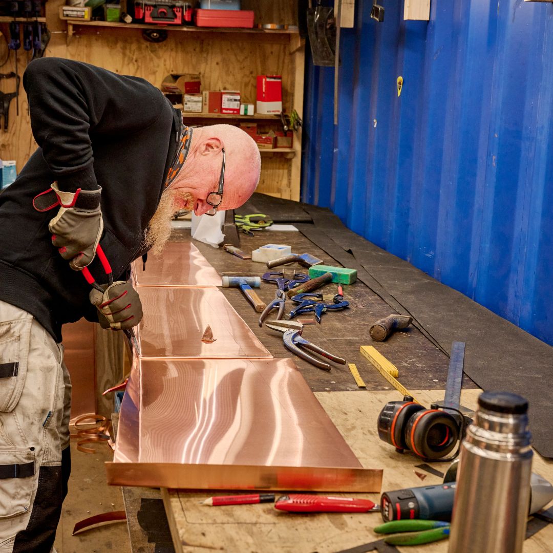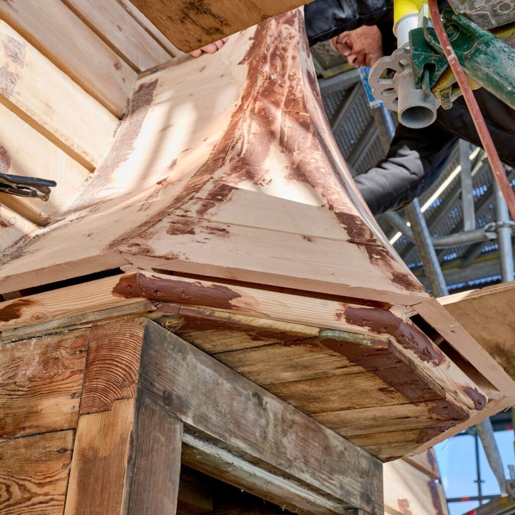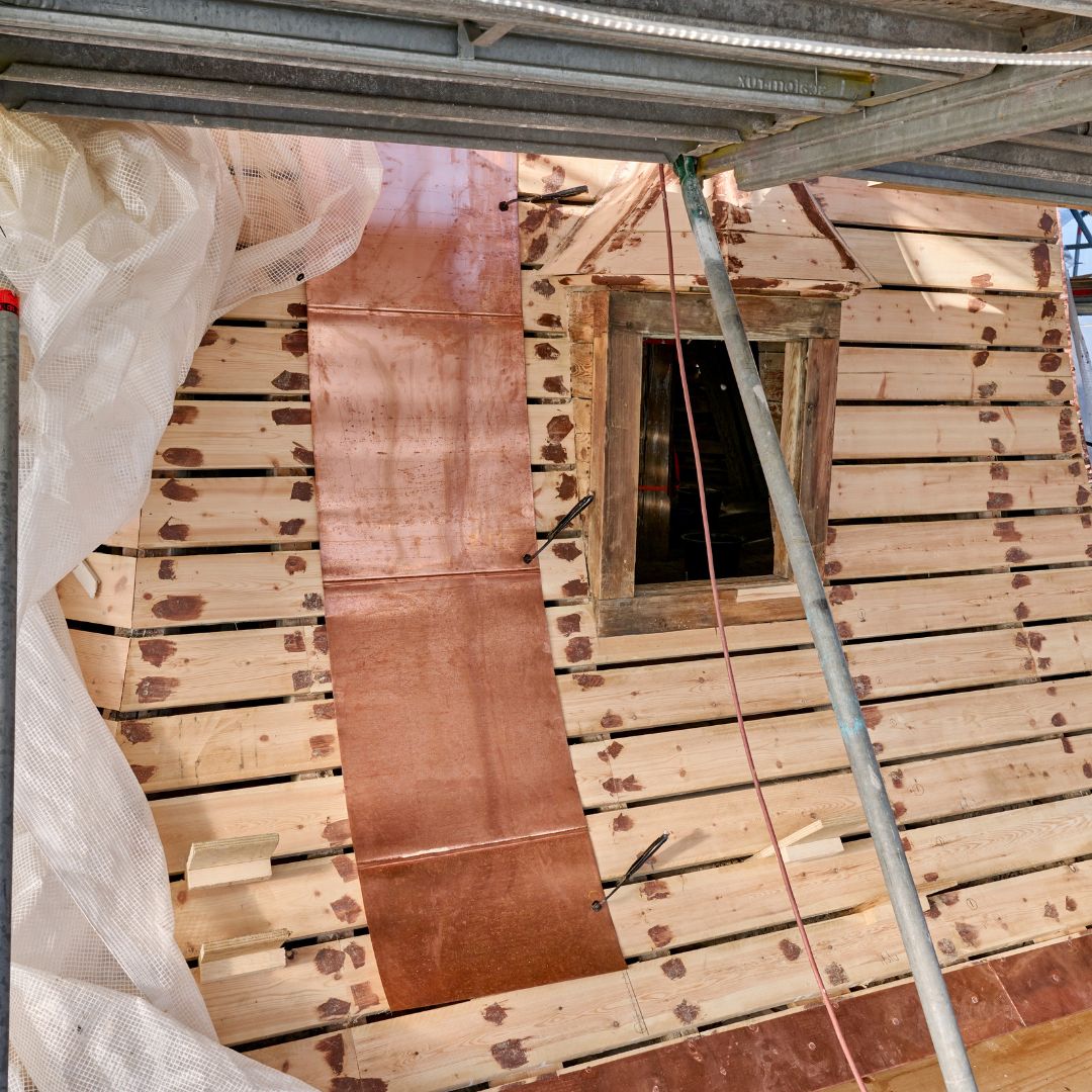 Vi skal skifte alt kobberet på tårnet. Når det demonteres, samles det sammen og sendes til omsmeltning til nyt kobber.