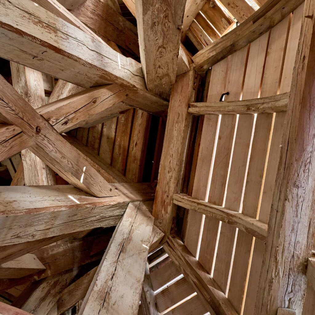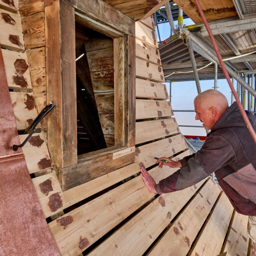 Den første del af vores arbejde går med at demontere dele af udsmykningerne på tårnet.