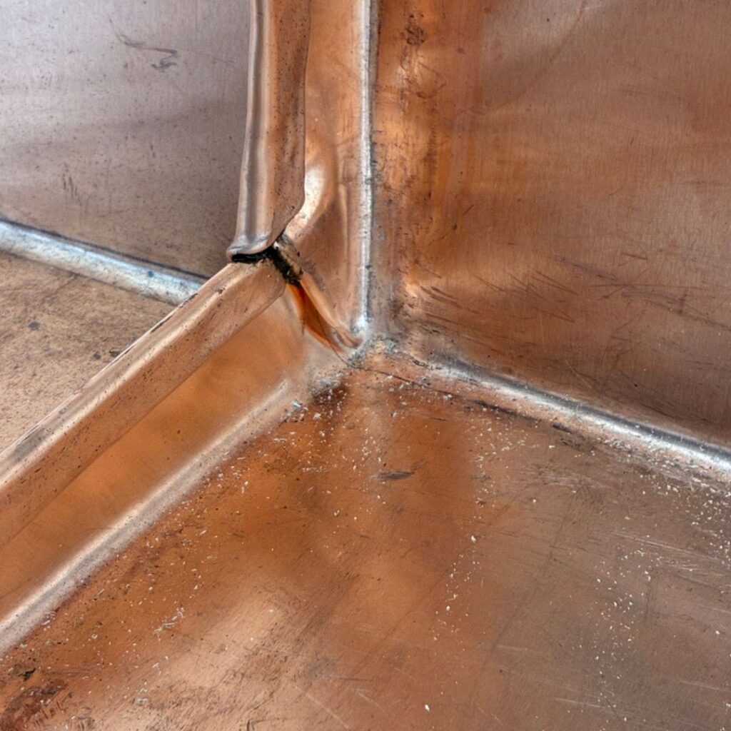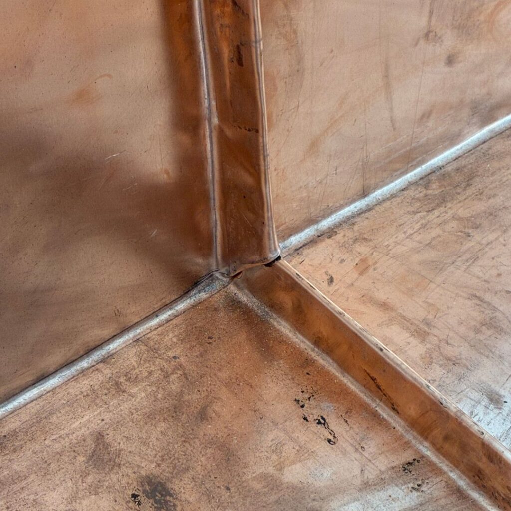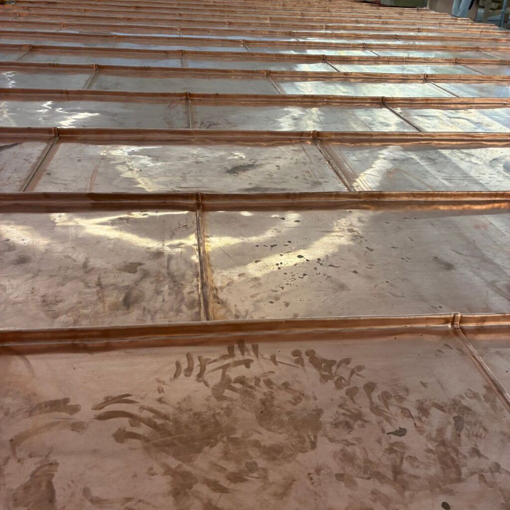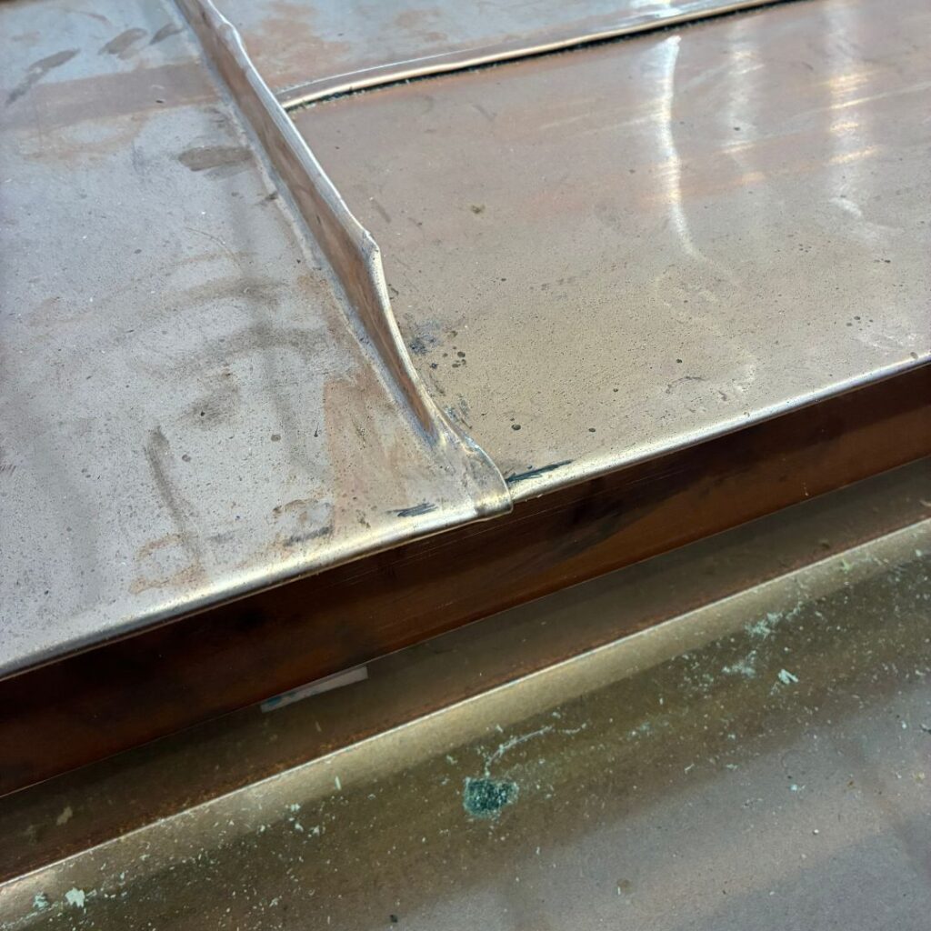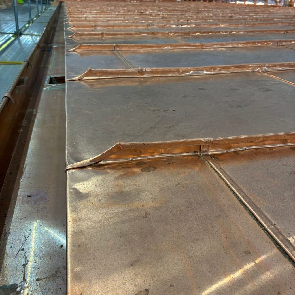 Når vi lægger kobberbaner på så flade tage, kræver det den helt rigtige teknik og grundighed, for at sikre, at kobberet kan være tæt i over 100 år. Sværhedsgraden ligger bl.a. i at tage med så lav en hældning, har et større pres i forhold til nedbør og derfor skal alle false dobbeltkittes.